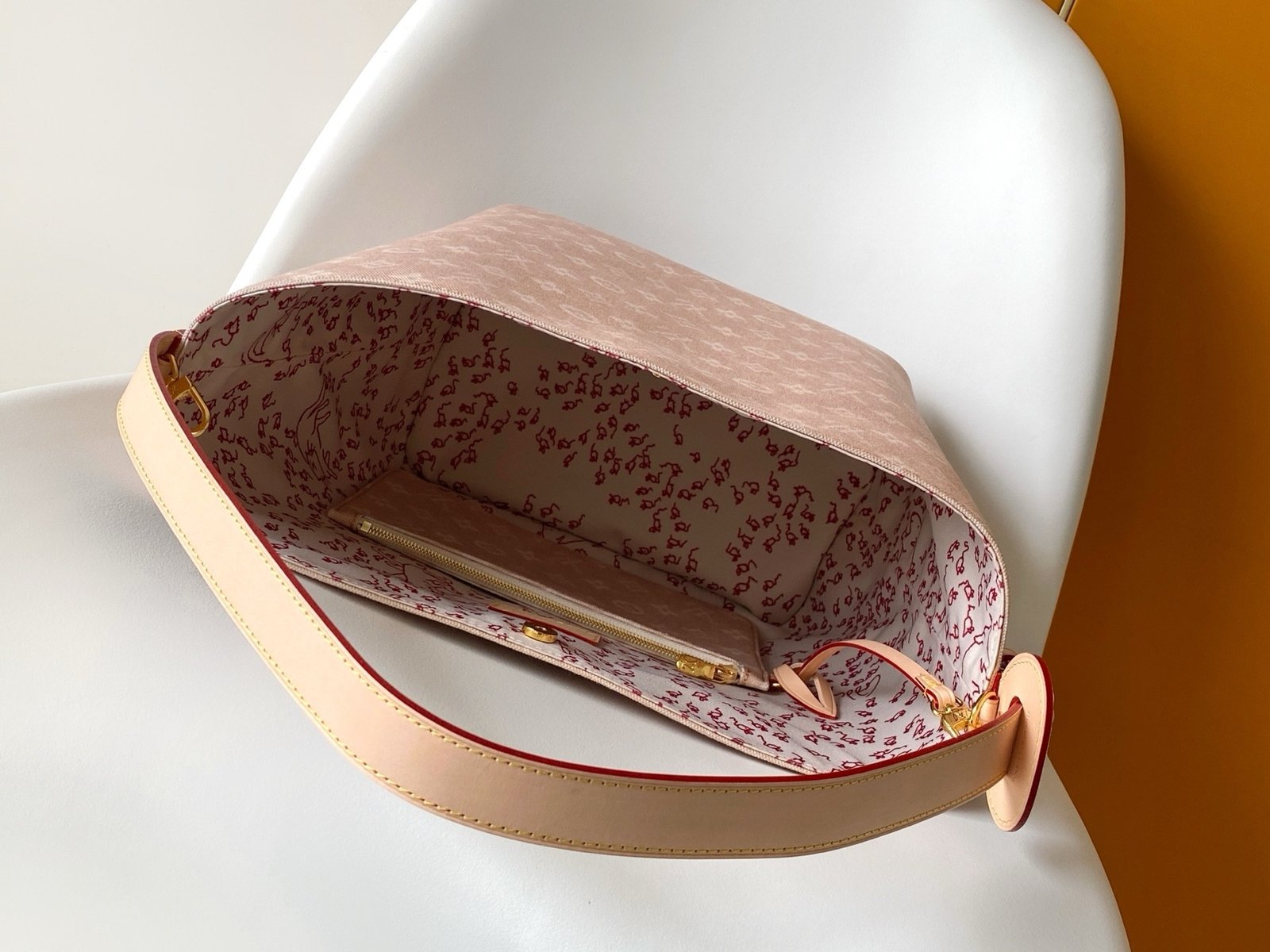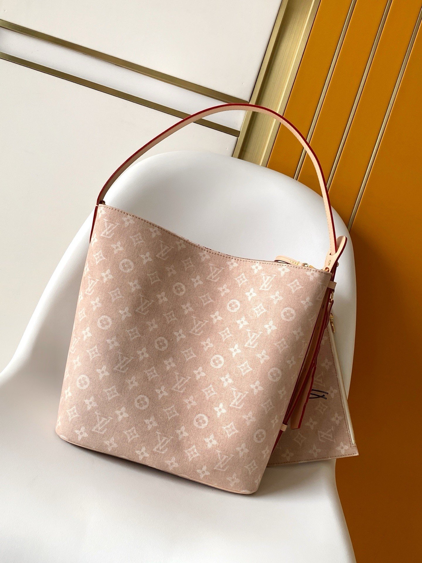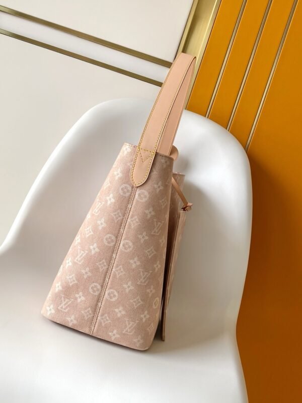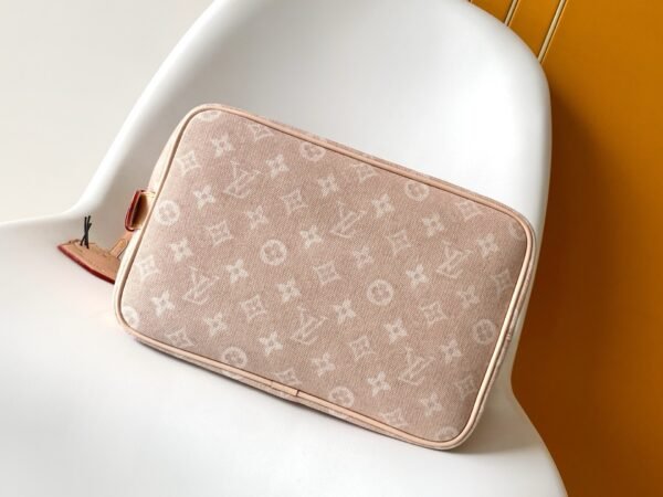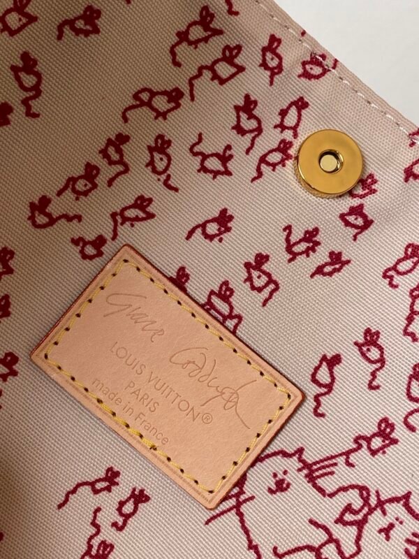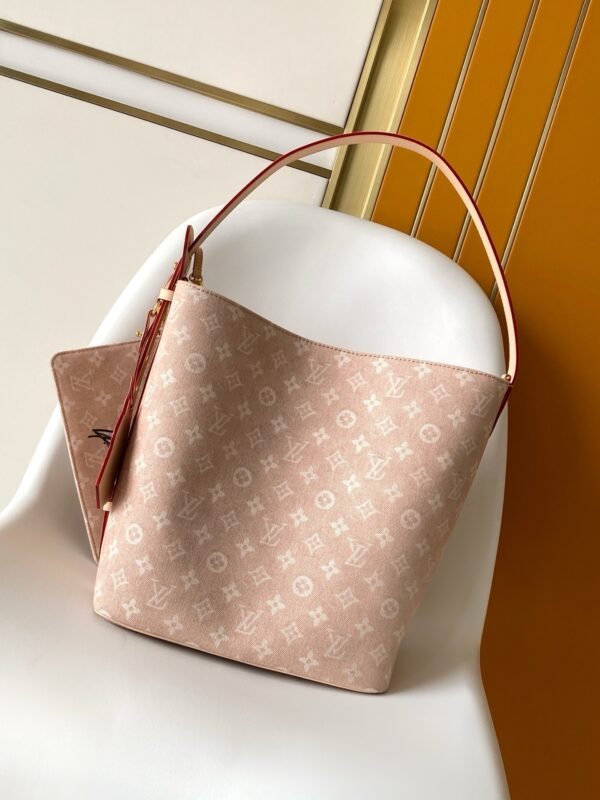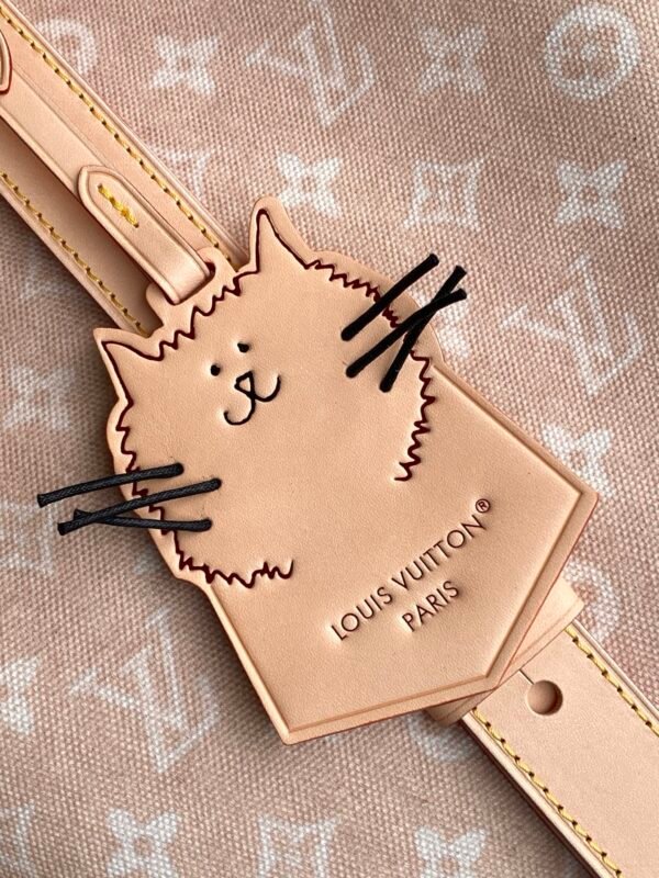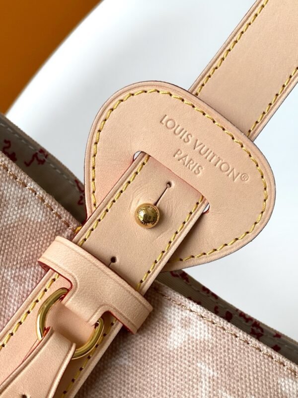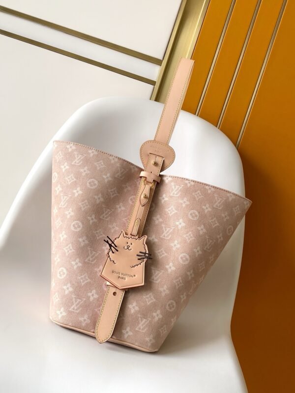 This handbag from the LV Travels With collection showcases the design aesthetic of fashion icon and artist Grace Coddington through its Meowgram pattern. The canvas body features calf leather trim and a playful cat-shaped key pouch. Its bucket silhouette easily accommodates daily essentials like notebooks, while the removable zippered pocket adds functional versatility. Meowgram coated canvas, cowhide leather trim, fabric lining, metal hardware, magnetic snap and hook closure, removable zippered inner pocket, detachable cat-shaped key holder, accommodates notebooks, smartphones, Zippy wallet, and keys. Shoulder strap: non-removable, adjustable! Model: M25727; Dimensions: 26x31x18cm (10.3×12.2×7.1in)
