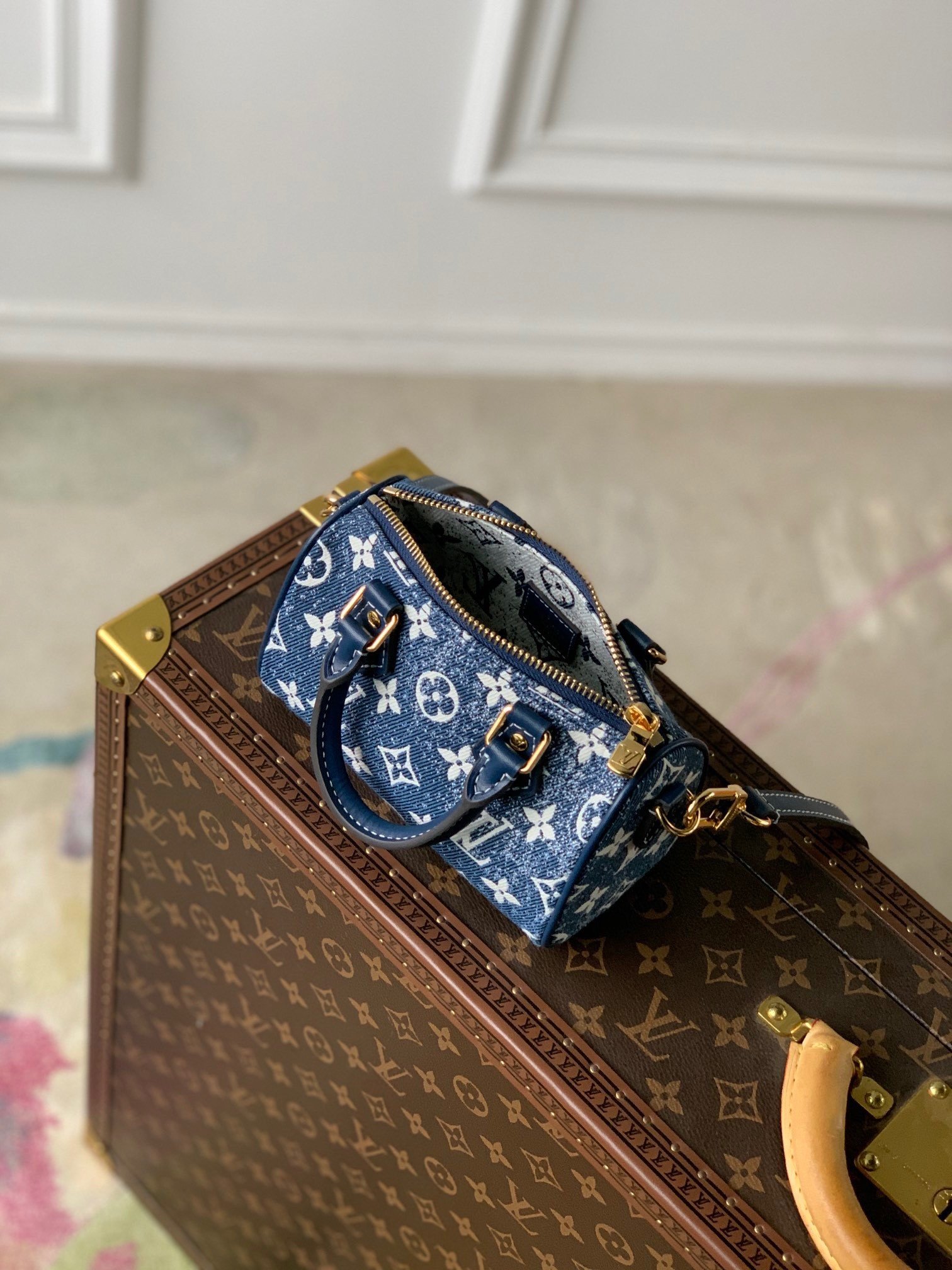 This nano speedy handbag is a compact interpretation of Louis Vuitton’s iconic speedy bag. Crafted from monogram jacquard denim, it features the monogram pattern and a sandwashed effect achieved through jacquard knitting techniques. The handles and long shoulder strap offer the choice of carrying it on the shoulder or crossbody, providing a stylish way to carry your essentials. Dimensions: 16.0 x 10.0 x 7.5 cm (Length x Height x Width)