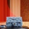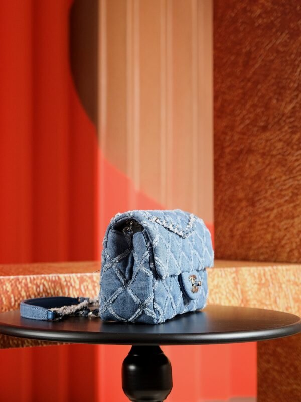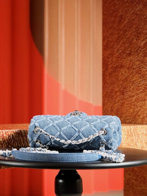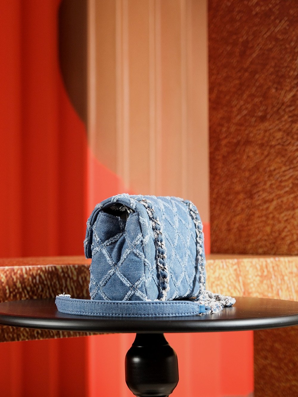 The unique denim chain strap exudes dignified elegance with a touch of effortless nonchalance.