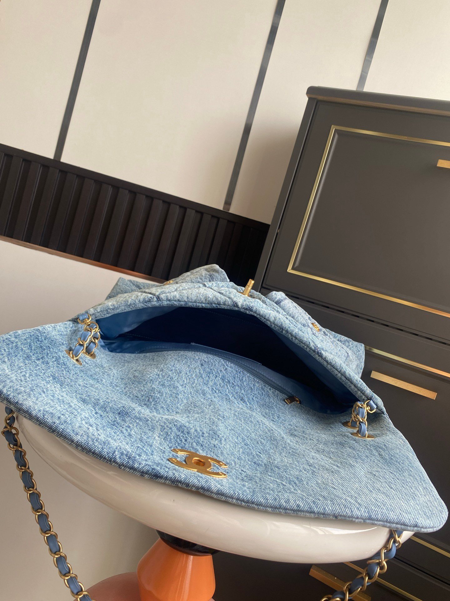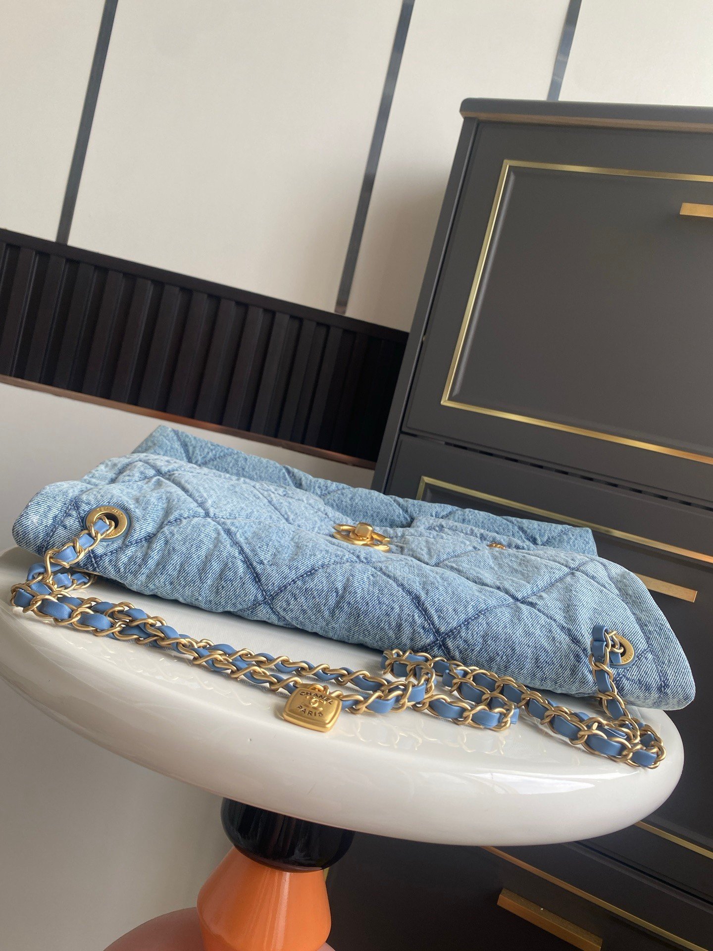 Ultra-luxurious feel—utterly irresistible! Denim paired with gold hardware, dual pockets, and a vintage chain pendant elevate the style. Instantly transforms the classic quilted pattern into a retro-chic statement. The gold double C logo shines brilliantly against the large flap, blending timeless elegance with a fresh twist. Soft, supple leather glides smoothly—exuding sophistication and grace. Highly practical with ample capacity. Stunning when worn.