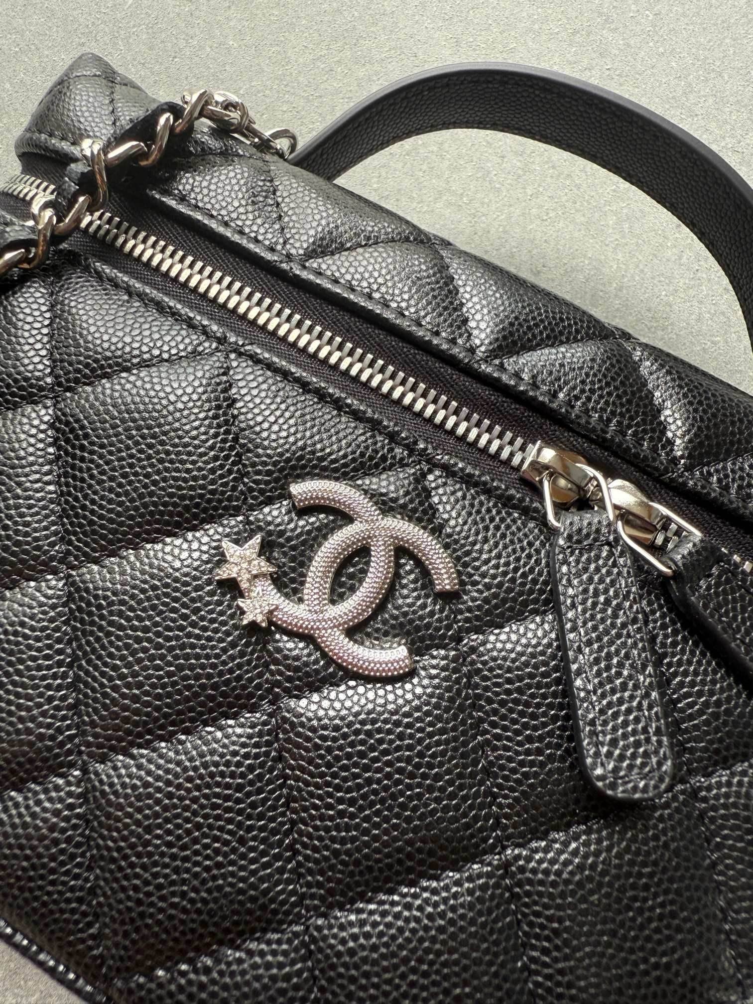 Authentic caviar-grain calf leather exterior and grained cowhide lining—fully leather construction for ultimate luxury. Logo hardware slightly larger than 25c, featuring engraved designs with star-shaped diamond accents for enhanced style.